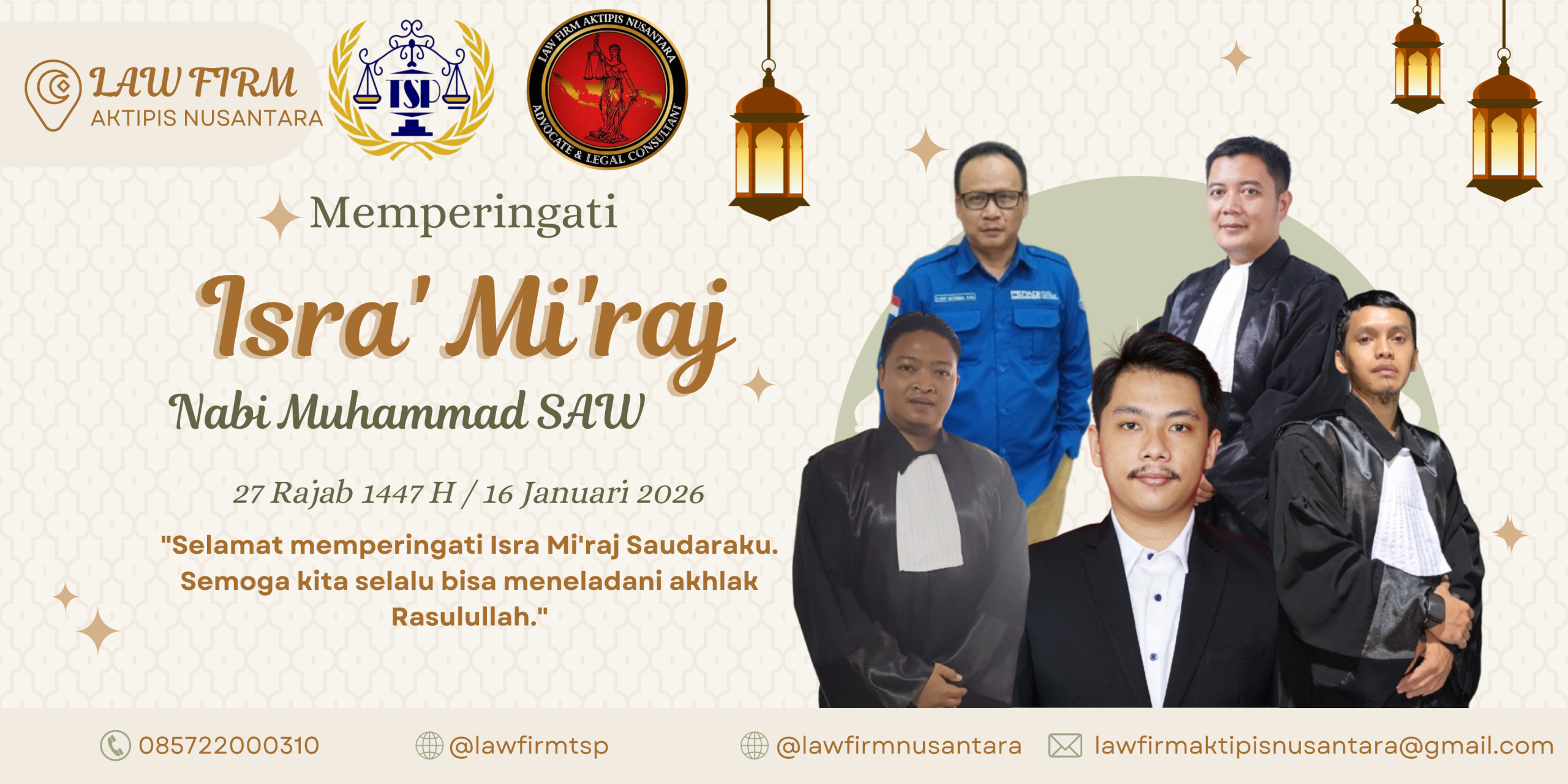 Staff dan jajaran LAW FIRM AKTIPIS NUSANTARA Kab. Sukabumi ASEP SUTISNA,S.H,M.H., SUHENDRA,S.H., ARI AGUSTIAN,S.H., ANDREA RIZKI FIRDAUS, S.H,. DEDE IMRON,S.H., DEDE PUAD HASAN,S.H., NURHIKMAT, S.H., ROESMAN, S.H., ARTHUR WILLIAM RAMBE, S.H., beserta seluruh keluarga besar LAW FIRM TS & PARTNERS mengucapkan selamat memperingati Hari Isra Mi’raj Nabi Muhammad SAW.